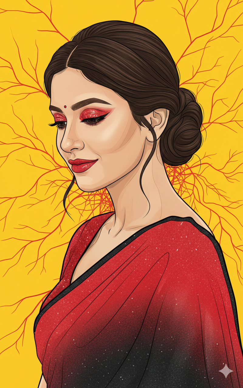 Convert the above image into ultra realistic portrait of only girl in side pose in hand drawn vector line drawing in yellow background.she should wear glittering red with black fade saree.she should be in bun hairstyle and elegant makeup .there should be many red nerves in yellow background full view of her.she should look down with smile